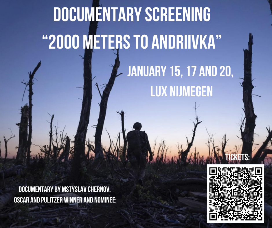 Movie screening on January 15, 17 and 20 at Lux Nijmegen “2000 meters to Andriivka” directed by a Ukrainian filmmaker, Mstyslav Chernov, a Pulitzer and Oscar winner. A documentary tells about the fate of Ukrainian soldiers near the Russian-occupied village of Andriivka. A must-watch for everyone as it shows the price paid for the freedom of Europe!