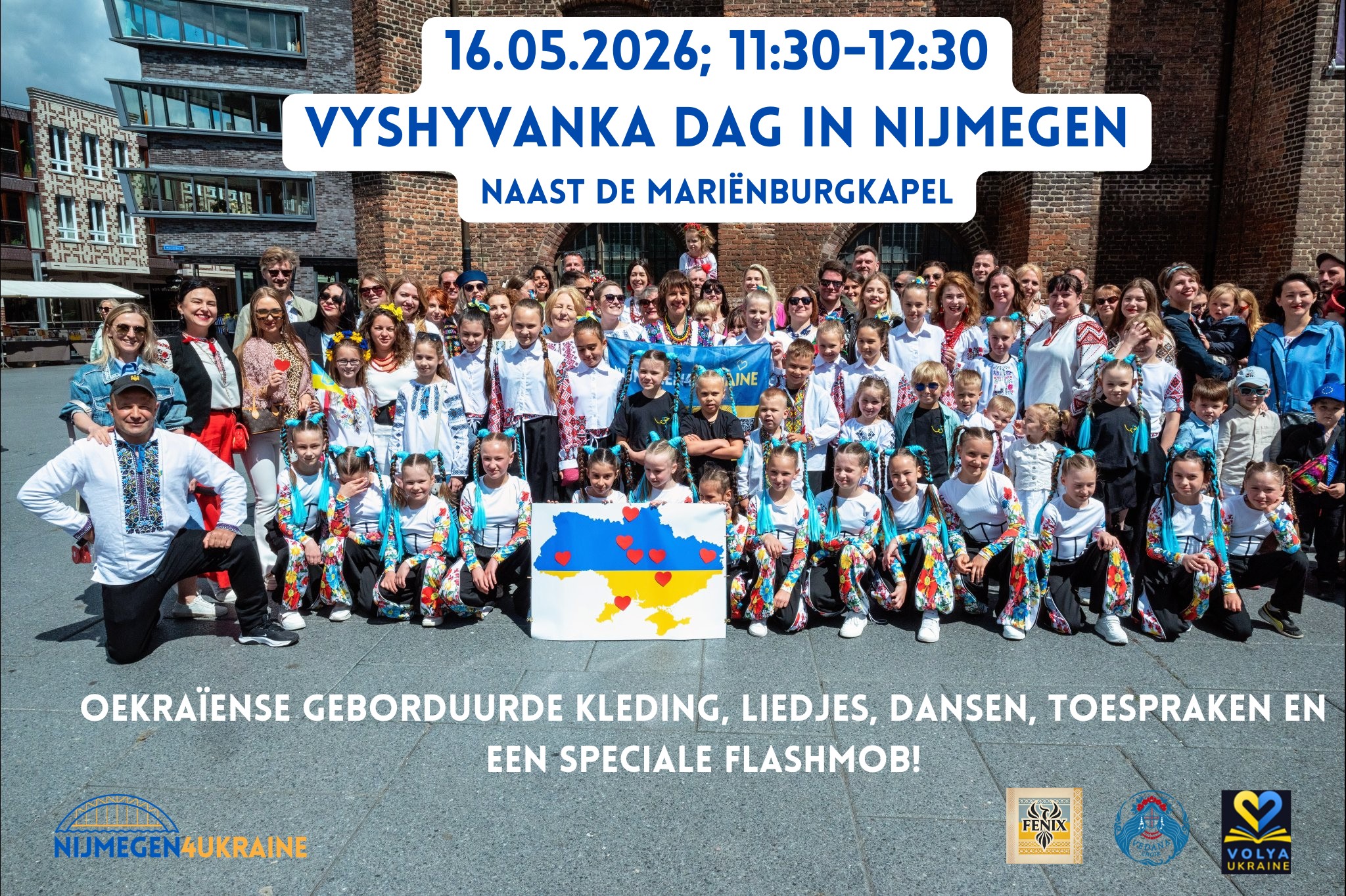 Ми вже вчетверте організовуємо День Вишиванки в Наймегені 16 травня з 11:30! Хор «Ведана» та ансамбль «Фенікс» готують нові пісні, а українські діти представлять нові танцювальні хіти зі спеціальним танцювальним флешмобом! Приходьте на площу перед Mariënburgkapel, одягайте вишиванки та українську символіку, щоб показати наші традиції в Наймегені та розповісти про їх особливе значення під час війни.